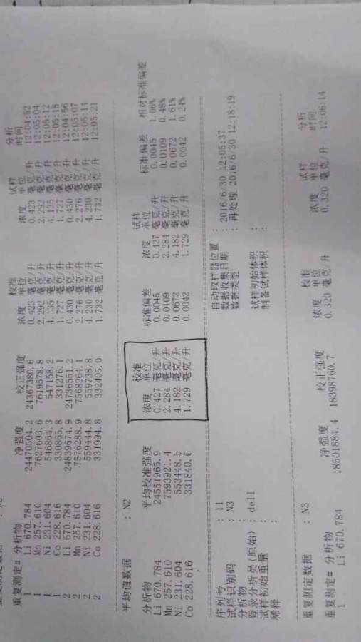 用ICP测试回收的三元材料,测试人员给的结果是镍钴锰锂四种元素的质量浓度,通过计算,感觉只是能算出来这四种元素之间的比例,那如果我想重新再合成新的三元材料,111系列的,假如取1g回收的材料,怎么计算出里面含有镍钴锰锂的量各是多少呢?我想重新调节比例,感觉无法计算啊,求有经验的人帮忙