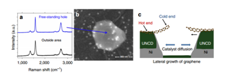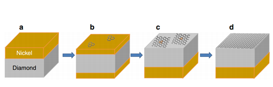 文章来源:低维材料 众所周知,在石墨烯器件的制备过程中,存在一个非常重要的挑战,那就是石墨烯在转移过程中往往会引起本征性能的衰减。所以在这种绝缘基地上直接生长石墨烯也是迫切需要的。之前的很多报道尝试用金刚石或者碳化硅在金属的诱导下转变为石墨烯,但这些方法往往又会引起金属的污染和无法大面积直接生长等问题。 Figure 1 | Wafer-scale growth ofgraphene on diamond. 在该项研究中,我们发明了一种将多晶金刚石在四英寸的硅片直接转变为高质量石墨烯的方法。该方法通过将顶部的镍薄膜催化剂快速热退火的方法来实现。这种方法最突出的优点就是后续不再需要任何的转移过程。通过调控反应过程,可以制备得到良好电学性能的单层到多层石墨烯。在800℃较低的温度下,可以获得单层的石墨烯,通过提高温度到1000℃可以获得多层石墨烯。 Figure2 | Growth mechanism of free-standing graphene 更有意思的是,可以实现在微米尺寸的洞上面,横向生长悬浮的石墨烯,并且这些石墨烯都是单晶的状态。这种悬空生长石墨烯的方法对实际的产品应用具有非常重要的研究价值。除此之外石墨烯还可以通过图案化金属沉积,选择性的在微米级别生长。该工作并用分子动力学模拟石墨烯在多晶金刚石上的生长过程,更好地阐明其生长机理。因此,这种制备方法对研究高性能、高能效纳米电子器件有非常大的推动作用。 Figure3 | Schematic of the Ni (111)-facilitated graphene growth. 相关研究成果最近刊登在知名刊物 NATURE COMMUNICATIONS (DOI: 10.1038/ncomms12099)上。 |