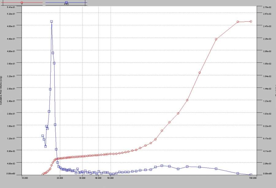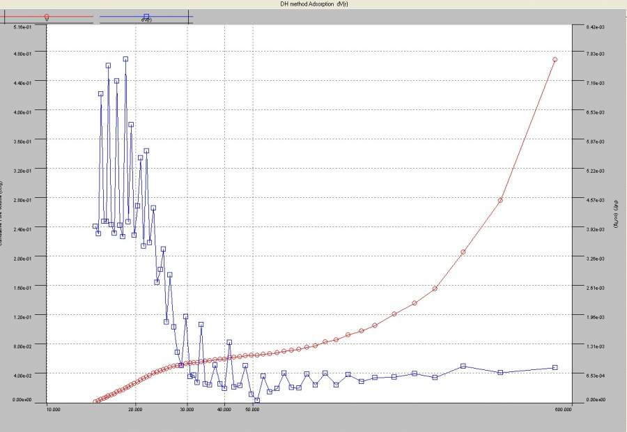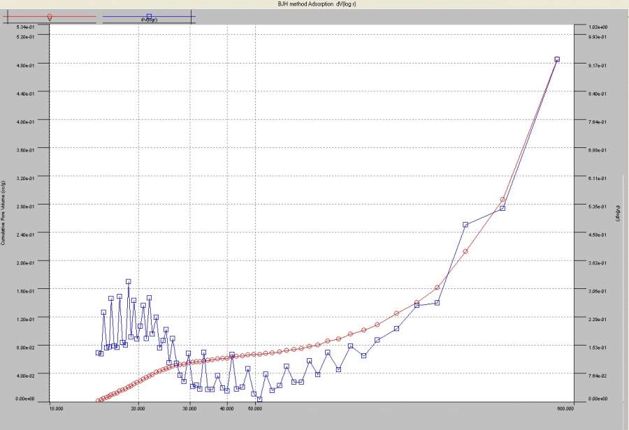 你的材料是大孔材料,而dv/dr和dv/dlogr区别在于,后者会把大孔区的微小变化放大,突出大孔区相对较多的孔的区域(孔最集中的地方)。所以你的材料选择dv/dlogr作图要好些。当然如果你认为大孔区的表征对你无用,那么两者都行 如果要表征大孔区的孔分布的话,你这个用脱附数据要好些,不过你的脱附孔径分布中低压区有个高峰,应该是假峰,所以你可以适当的说明下。这个假峰的形成原因你可以查下相关资料。 |