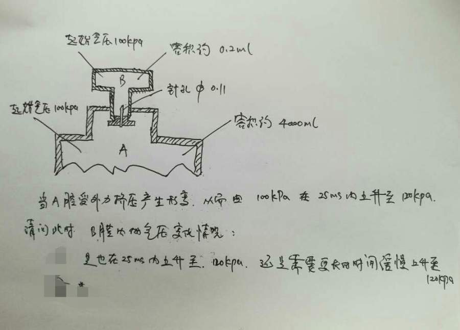 现有A、B两个密闭空腔,二者中间通过一极细的针管相连。请问,当A腔受外力挤压产生形变,从而使得A腔气压在25ms内由100kpa上升至120kpa。那么此时,B腔内的气压变化是否也是在25ms时间内由100kpa上升至120kpa? 或B腔需要更长的时间(大于25ms)上升至120kpa? 谢谢! 啊地方地方的.jpg |