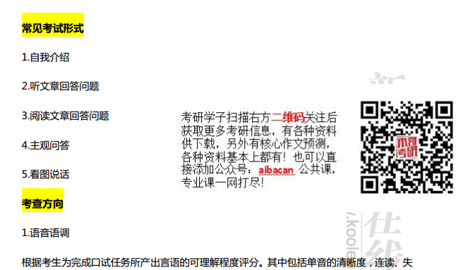 2016考研复试口语讲义 .pdf 常见考试形式 1.自我介绍 2.听文章回答问题 3.阅读文章回答问题 4.主观问答 5.看图说话 口语考试.png [ Last edited by xiaoru987654 on 2016-7-10 at 11:04 ] |