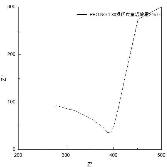 各位大侠,小弟刚刚开始做固态电解质,做了一个简单的LiTFSI掺入PEO的固态电解质膜,想测试一下阻抗,我将所得固态电解质膜放置在80摄氏度烘箱内烘了4h后室温静置24h,在手套箱内制成不锈钢阻塞电极,压成了纽扣电池,在仪器上得到下面的阻抗谱,但不像文献中的半圆阻抗谱,而是四分之一半圆,求助各位大侠,这是什么原因。。。。。。 PEO NO.1 80℃室温放置24h.png |