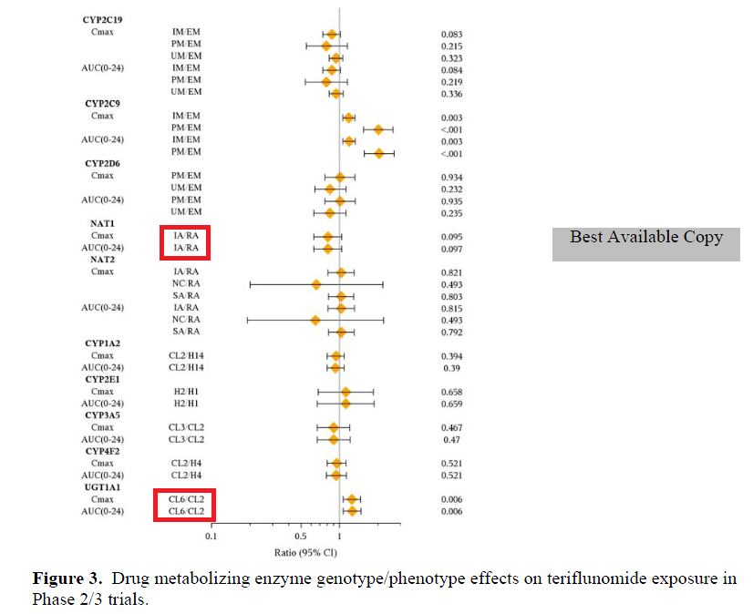 在看FDA公布的特立氟胺临床药理学综述时,涉及到药物基因组学部分,研究代谢酶和转运体对特立氟胺系统暴露的影响, 下图中左侧第一列是代谢酶和转运体,第二列是表型,红框标出的NAT1和UGT1A1的看起来应该是两种酶的表型,但不明白具体代表什么,求教大神,红框标出的部分代表什么意思,如果是酶的表型,那它对应的基因型是什么,谢谢 Fiure3.png |