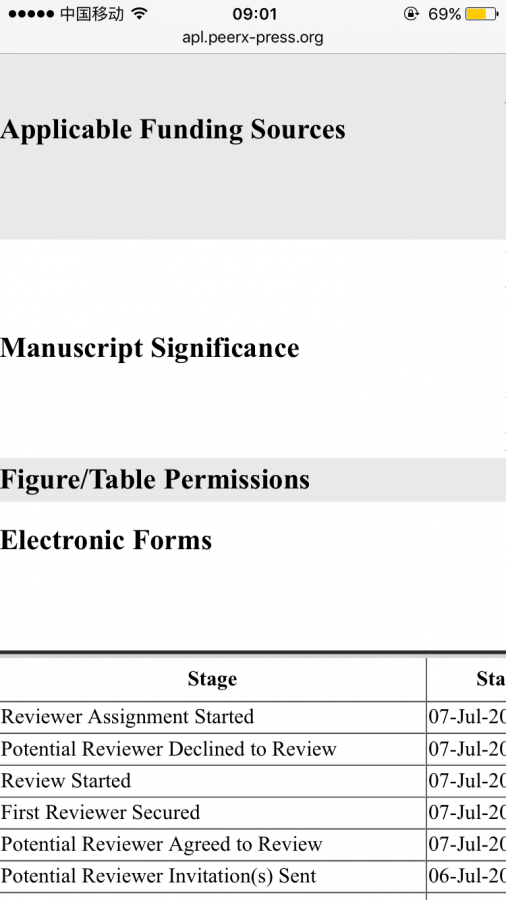 投稿一篇APL,如图状态。好几天过去了只有一个审稿人在审。最近的一个状态是说明编辑一直在找另外一个审稿人找不到吗?求有经验的大神帮忙看看。有点焦虑…… 发自小木虫IOS客户端 |