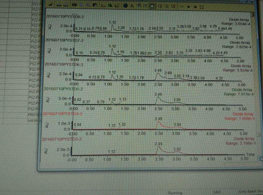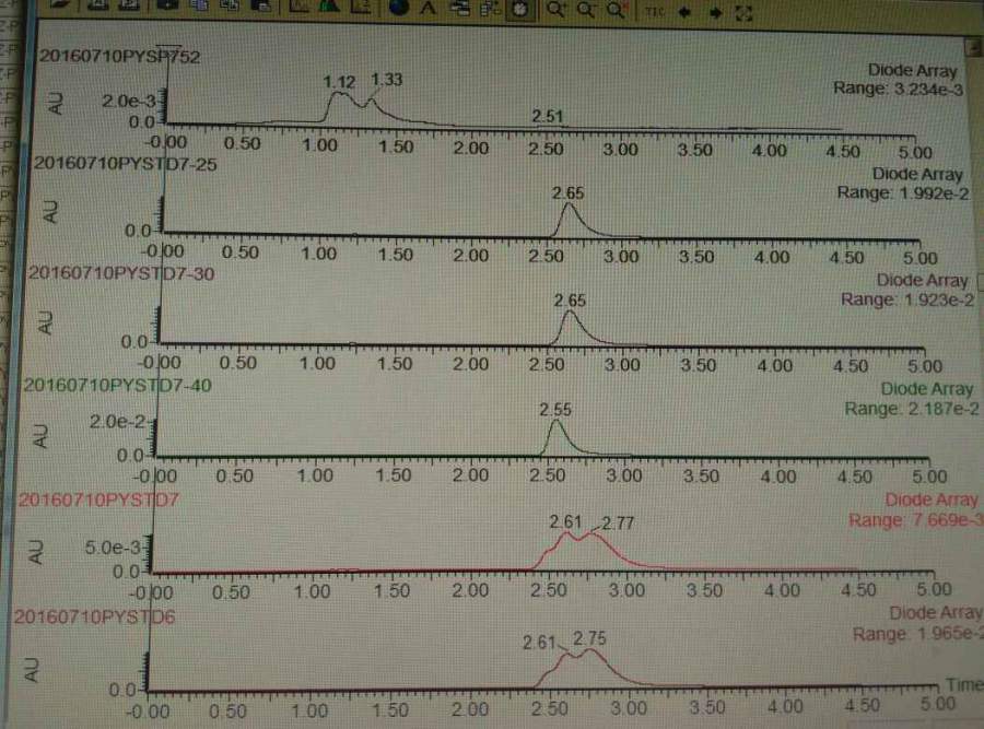 超高效液相色谱流动相甲醇/水=3/7,柱温30,为何标线中浓度越低,保留时间2.5的峰越低,1.1的峰越高,我是用色谱纯配的标线,请问为什么?而且,当时试方法的时候峰型很好,自动进样之后就好宽呢,请大神赐教? 发自小木虫Android客户端 |