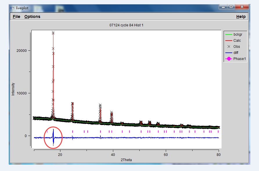 (1)教程上面经常是几个参数一起精修,但是网上或者小木虫上面很多说,最好一步一步精修,到底哪个好呢? 尽信书则不如无书,Rietveld精修没有固定套路,有些参数相关性很强,不要一起修,否则可以几个参数一起精修,节约时间啊! (2)精修的顺序具体应该哪样?大体的应该是仪器参数,再修结构参数,对吧。但是教程上面,是 backgrond+scale 先一起精修,再精修 zero,再精修 cell parameter,再精修峰型函数(GU, GV, GW三者一起精修),最后精修原子坐标和原子占位。但小木虫上很多同学都说,顺序是scale---zero---backgrond---FWHM---Shape---cell parameter---原子位置---温度因子---择优取向等。问题是大家的顺序是什么呢? 如果真像你所说,则教程更不专业;木虫上同学也不完全对,background可以靠后,原子位置要看情况,都在特殊位置的话没法修。 (3)没有收集高角度的衍射峰,比如120度,最好不要精修温度因子把?我们一般的测试是10-80度,做不了120度的。那可以直接从类似的文献中引用吗? 10-80 不合适,低于20度,峰会严重不对称,UVW等次级峰型参数不是完全一致,RIETAN可以修初级参数,但是需要点经验。80度太低,这样数据/参数比很低, 没法精修各向异性参数。 (4)我最近的精修结果,CHI2=2.327, wRp=7.4%,似乎数据还凑合。但是感觉17度的衍射峰,很明显可以继续精修,但我已经进行不下去了。请问什么原因呢?是不是峰型不对,感觉上、下偏差基本差不多,拟合的峰明显窄于测试峰。 你的结果还不错,但是低角度峰对称性低,建议精修相应参数。 |