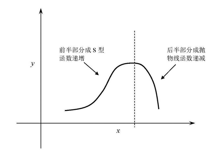 有两个变量,二者呈如图所示关系,前半部分成S型函数递增(类似logistic函数),后半部分呈抛物线递减,请教各位如何用一个函数表达二者关系,友情提醒:不用分段函数。