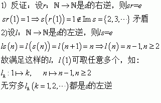 | 令N表示自然数集合{1,2,3.。。。。},且令s:N→N,s(n)=n+1.证明s没有右逆,但有无穷多左逆 |