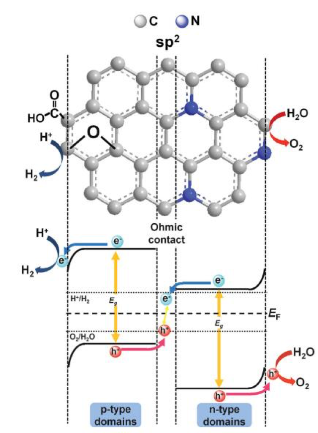 层主,你说的那篇文章,我简单看了一下。光催化的问题我不懂,但我猜想你这里的跟高中学的电解池有点像,文章中说的大概意思就是原来的那个go材料分两步处理,第一步用氨气,目的是引入N元素,占据C的格点,形成n型掺杂,这与我们先前讨论的原理是一致的,而第二部它又弄个氧化处理,这一步我觉得是引入了间隙氧原子,它起受主作用,能形成空穴。临近的两个量子点,一个是替位杂质形成的n型量子点,一个是间隙杂质形成的p型量子点,小部分区域就形成了pn结,由于是在水里泡着,就形成了回路,外界有光照射的时候,激发sp2杂化区域(可以理解为pn结的空间电荷区)产生过剩载流子,正电荷给氧,负电荷给氢,两者变成气体跑了。这个过程有点像太阳能电池,只不过它将太阳能转化的电能还没来得及传到外面被人利用,就先行转化成了化学能储存起来(等氢氧一反应就可以释放这部分化学能)。我的分析是根据文中的几句话,贴上来大家一起讨论讨论,说的不对的还请见谅 发自小木虫IOS客户端 |