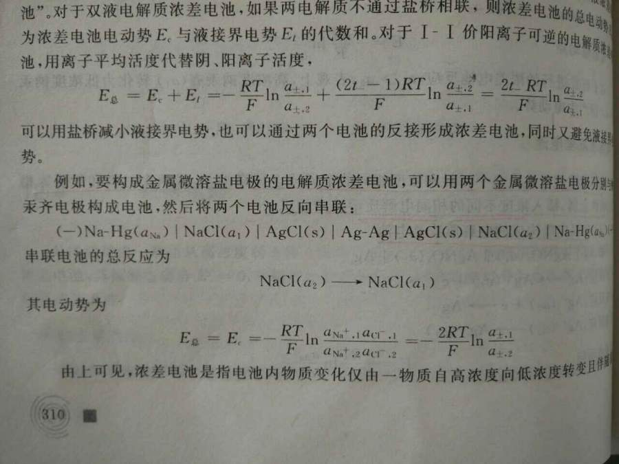 为什么可以通过两个电池的反接可以消除液接电势?这个串联电池的总反应是怎么写出来的?金属微溶电极构成的电解质浓差电池写出来的只是氯离子的浓差,没有钠,E总又和钠的浓度有关 发自小木虫Android客户端 |