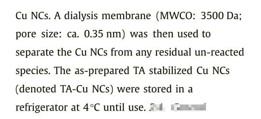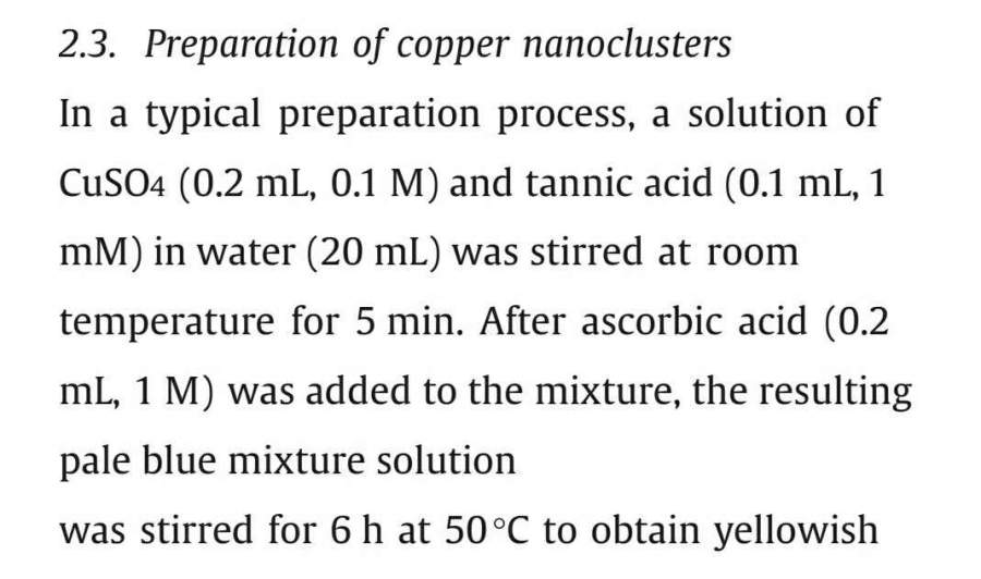 典型的铜纳米团簇制备过程: 1 将CuSO4(0.2mL,0.1M)与鞣酸(0.1mL,1mM)的混合水溶液在室温下搅拌5分钟; 2 向混合溶液中添加抗坏血酸(0.2mL,1M),得到的浅蓝色溶液;将该溶液在50℃搅拌6h,得微黄色铜纳米团簇; 3 以透析膜(MWCO: 3500 Da, 孔径约0.35nm)将铜纳米簇与未反应物分离; 4 在使用前,将所制备的TA稳定铜纳米簇(命名为TA-Cu NCs)置于冰箱中,4℃保存。 供参考。 |
