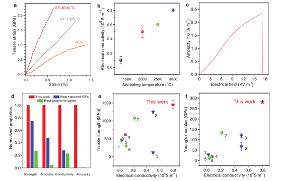 文章来源:低维材料 石墨烯由于具有极高的抗拉强度(130GPa)和杨氏模量(1100GPa),良好的导电性(108S m-1)和导热性(5200W m-1K-1)等一系列优异的性能,被认为是构造多功能、高性能碳质纤维的理想材料。高超教授团队首次提出并率先制备了高性能多功能的新型石墨烯纤维,它是由石墨烯片沿轴向有序堆积排列而成的连续组装材料,具有高导电、高导热、低密度等特性,已在柔性导线、超级电容器、太阳能电池、锂电池、传感器等方面显示出了诱人的应用前景,成为一个新的学术研究的热点方向。然而,目前的石墨烯纤维的力学强度和导电性仍远远不如单层石墨烯,限制了其在可穿戴设备和功能性器件等领域的应用。研究发现,石墨烯纤维与单层石墨烯之间的性能差异,主要是由石墨烯纤维层状结构中的众多缺陷所引起的。因此,如何同时减少石墨烯纤维中的所有缺陷,是制备高性能石墨烯纤维的关键所在。 图1 石墨烯纤维的全尺度协同缺陷工程降低了原子尺度到宏观尺度上的所有缺陷 针对这一问题,高超教授团队立足石墨烯纤维的结构调控及结构与性能关系,开展了系统深入的研究。首次提出了“全尺度协同缺陷工程”策略,通过控制纺织原液的浓度和喷嘴直径,优化湿法纺丝工艺;以及多级拉伸诱导取向、纤维细旦化和高温热还原等关键技术创新,成功实现了高性能石墨烯纤维的规模化制备。 图2 全尺度协同缺陷工程制备的石墨烯纤维的力学和电学性能 通过这种方法规模化制备的石墨烯,直径最细可达到1.6μm,约为头发丝的五十至一百分之一。力学强度最高可以达到2.2GPa,杨氏模量最高可达400GPa,电导率达到8*105S/m,代表了石墨烯纤维目前最高的性能水平。 图3 高性能石墨烯纤维的应用展示 相关研究成果在线发表于知名期刊Advanced Materials上。 (DOI: 10.1002/adma.201506426. Ultrastiff and Strong Graphene Fibers viaFull-Scale Synergetic Defect Engineering. Zhen Xu, Yingjun Liu, Chao Gao, etal. First published on 17 May 2016.) 声明: 1. 本文版权归低维材料所有,转载请与我们联系。 2. 因学识有限,难免有所疏漏和谬误,恳请批评指正! |