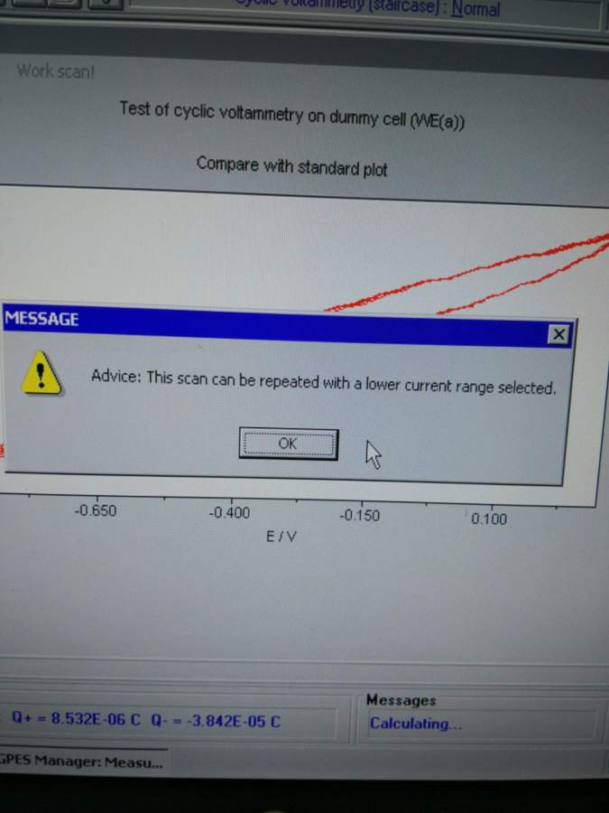 如题,瑞士万通AUTOLAB电化学工作站循环伏安测试时扫几圈就提示下图该圈要在小电流范围下重测(祥见贴图),但是之前这个范围没有问题的,不知道是不是设置有问题,小白求指点,在线等! CV测试问题.jpg |