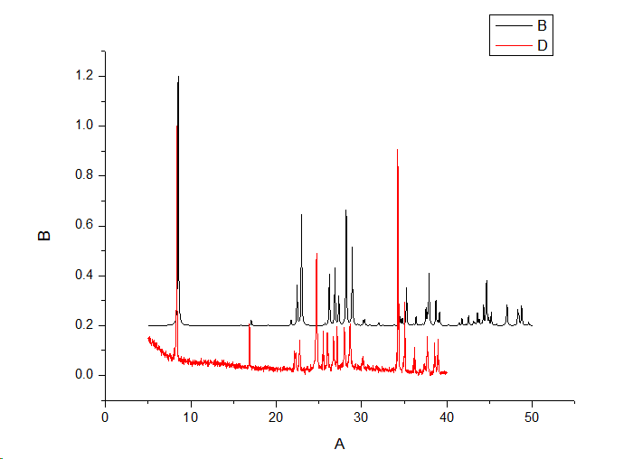 各位大神,初涉XRD,求解一些问题。合成文献中的已知晶体,对比XRD图,有一点区别,哪个好心的大神,可否告知一下,是合成了同一物质,还是有杂质,黑色的是标准图 L24ENM)@[L@UG]A[}P_~FUL.png |