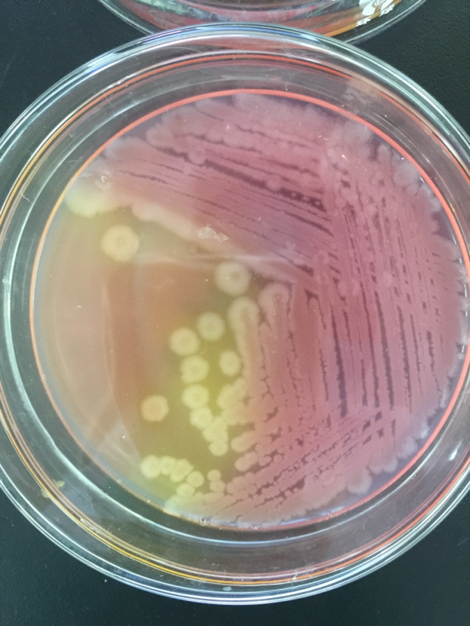 如下图所示,是在MYP上培养出的菌落,三线法划板,一开始产生了粉红色晕圈,最后的单菌落呈现黄色晕圈。请问这是蜡样芽孢杆菌吗?谢谢!