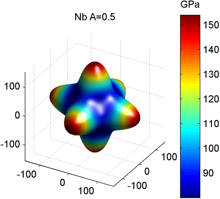 下面的代码绘制几种金属的杨氏模量三维各向异性曲面, 弹性常数来源于这里.