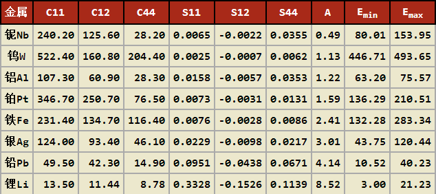 为了让大家有一个更直观的了解, 我们把具有不同各向异性值的立方金属选取具有代表性几个, 列于下表