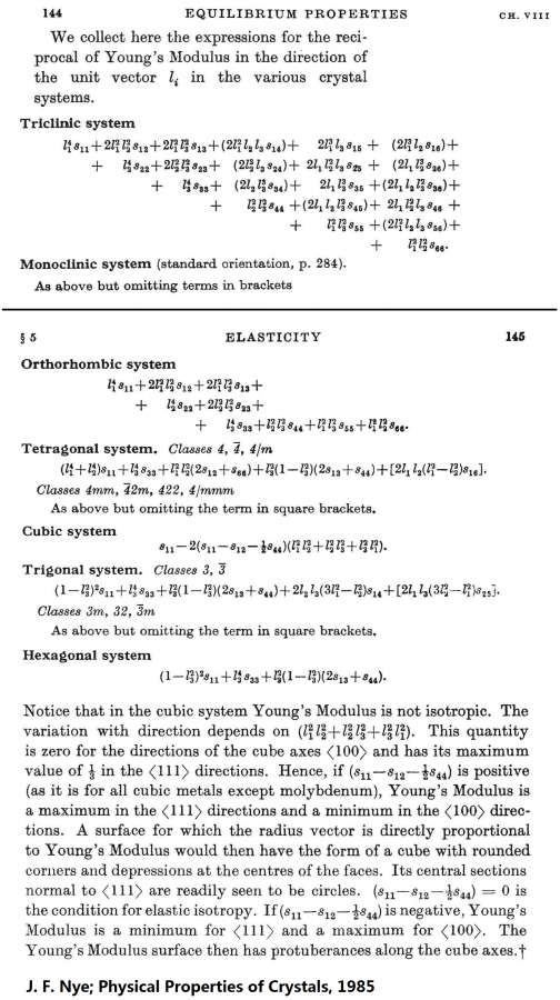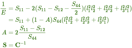 对于立方晶体, 我们可以用与[100], [010], [001]三个晶向的方向余弦来表示任意方向的杨氏模量, 结果如下