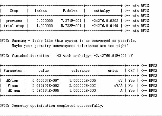 | 请问这样算不算结构优化成功,dE/ion: Yes max Force: No max displacement:Yes, 但是下一行显示 Geometry optimization completed successfully, 并且在接下来 Final Configuration 里面显示有 at least 2 warnings. 图片在下帖,先谢谢了,在线等 |
