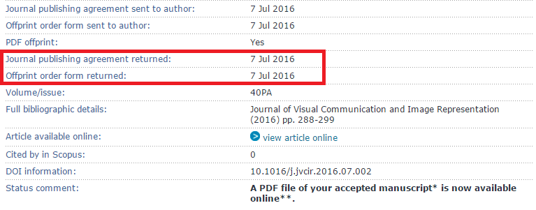 没事的,放心吧。赶紧联系导师让他把相关邮件转发给你,以加快出版速度。弄好之后会出现7楼框出来的日期内容。第一个就是版权信息,一般指有无商业利益,通讯作者代签就行;第二个就是纸质版印刷订阅的数量,有时可能还要提到彩印选择与否;status还会变,当你校完稿之后这里会显示你不能再修改了;论文校稿只有在你签完协议和纸质订阅数量后才会发邮件通知你可以校稿了。 发自小木虫Android客户端 |