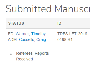 我前段时间投稿Remote sensing lettters,收到回复意见后在第五个星期将修改稿返回。开始的状态是邀请审稿人,两天后状态变为Referees' Reports Received,看状态应该是审稿人的意见已经到了副主编手上,这个状态已经持续了一个多星期。有没有投过该期刊的有类似经验分享一下。 1.PNG |