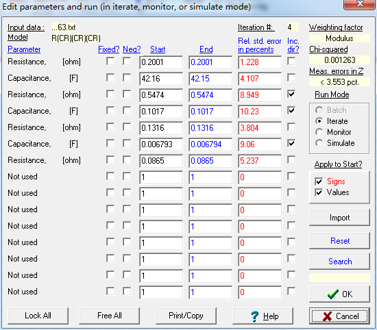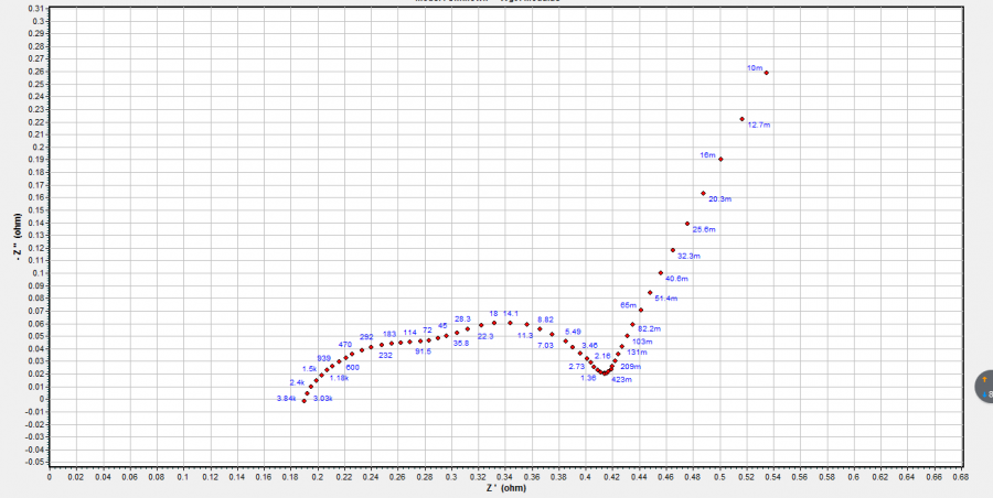 锂离子电池,测试其交流阻抗,用ZSimpWin分析交流阻抗,求大神分析下我的等效电路及其他信息。各个元件符号表示什么,怎样分析这些等等。。。尽量详细些,我现在对交流阻抗只有粗略的了解。急!非常感谢! 图片1.png 图片2.png 图片3.png |