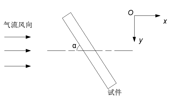 矩形试件暴露在速度为v、气体密度为ρ的气流中,试件面积为A,侧面积为B。忽略摩擦力。试件与气流方向呈α角度,如图所示。请问矩形板所承受的x和y方向的作用力Fx和Fy如何计算? PS:其实我认为Fy始终为零,但我老师始终说Fy不为零。这是我的计算方法:风压P=1/2 ρv^2,Fx=P(Asinα+Bcosα),Fy=0 试件暴露在气流中示意图 |