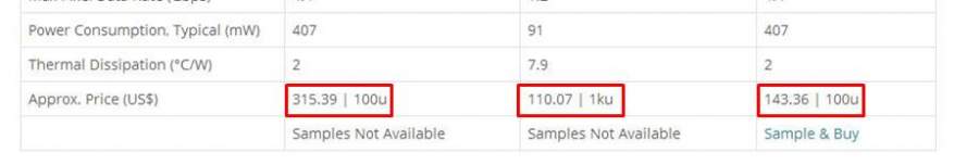 想买一些TI公司的DMD芯片,将价格上报给导师,但是他们官网上的商品信息介绍中的价格没看明白,求解答! DMD芯片网站:http://www.ti.com/product/dlp4500nir 如图中:Approx. Price (US$) 一栏中,315.39/100u、110.07/1ku,143.36/100u表示的什么意思?是315.39美元每100片,还是以100片采购的话,每片是315.39美元?还是其他的意思?求知道大神解答!谢谢~ QQ截图20160726141120.jpg |