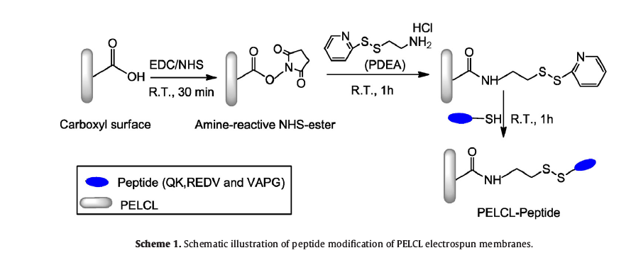 请问在用短肽修饰PELCL表面时,另用到了PDEA,请问用PDEA的目的是什么呢?与直接用短肽和活泼酯中间体反应生成酰胺键相比,先用PDEA与活泼酯中间体反应的优势是什么呢?(附有图片) 问题.PNG |
