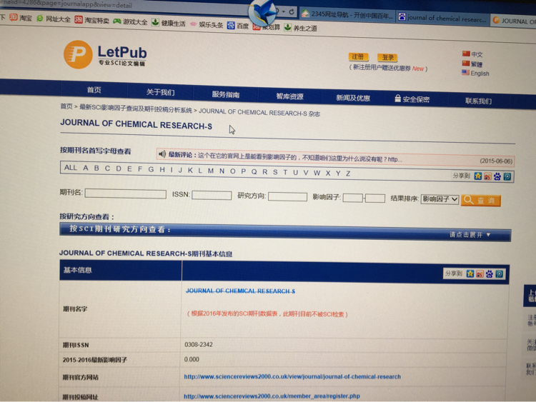 JOURNAL OF CHEMICAL RESEARCH Monthly ISSN: 1747-5198 SCIENCE REVIEWS 2000 LTD, PO BOX 314, ST ALBANS, ENGLAND, HERTS, AL1 4ZG Coverage Science Citation Index Science Citation Index Expanded Current Contents - Physical, Chemical & Earth Sciences 这个期刊仍然是SCI检索的,2015年影响因子是0.661。 |