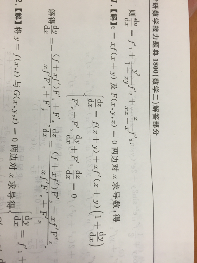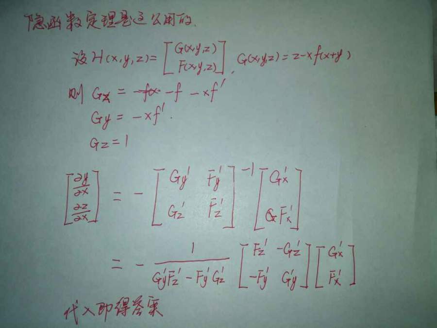 设y=y(x),z=z(x)是由方程z=xf(x+y)和F(X,y,z)=0所确定的函数,设y=y(x),z=z(x)是由方程z=xf(x+y)和F(X,y,z)=0所确定的函数,其中f,F分别具有一阶连续导数和一阶连续偏导数,求dy/dx,dz/dx 答案是同时对x求导,我自己做的时候,对F函数使用隐函数求导法求dz/dx,最后得到的结果却出问题了,不知道错在哪,求指教! 发自小木虫IOS客户端 |