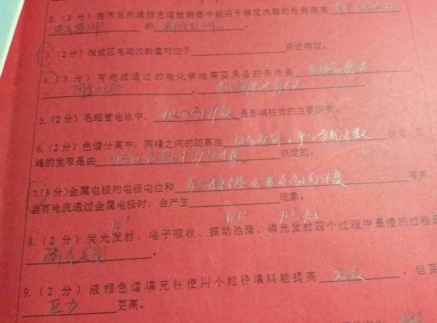 第一次发帖,希望不要沉掉…… 3,4,7题 3的话书上没有讲过,,找了好多资料也没有…昨天无意间看到个表格说微波内的属于分子转动能级跃迁类型。。跃迁类型可以是除了σ-σ*这种之外的吗。。 4题的话,原电池条件是,活泼性不同的两电极,电解质溶液,闭合回路,发生氧化还原反应,,电解池的话,应该后面三条了,没有活泼性不同的两电极,,他问有电流通过的电化学池,应该是综合两者,我写的后三条,不知道够不够准确请看一下。。 7题,我的天,,金属电极哪里讲这些啊?!电极电位的话,按计算公式来说我觉得应该是电极本身性质和溶液中离子的浓度,,第二空纯粹不知道填啥了。。溶解吧0类电极不溶解啊,。极化?可极化算现象吗?求大神讲解。 @superyeast 发自小木虫Android客户端 |