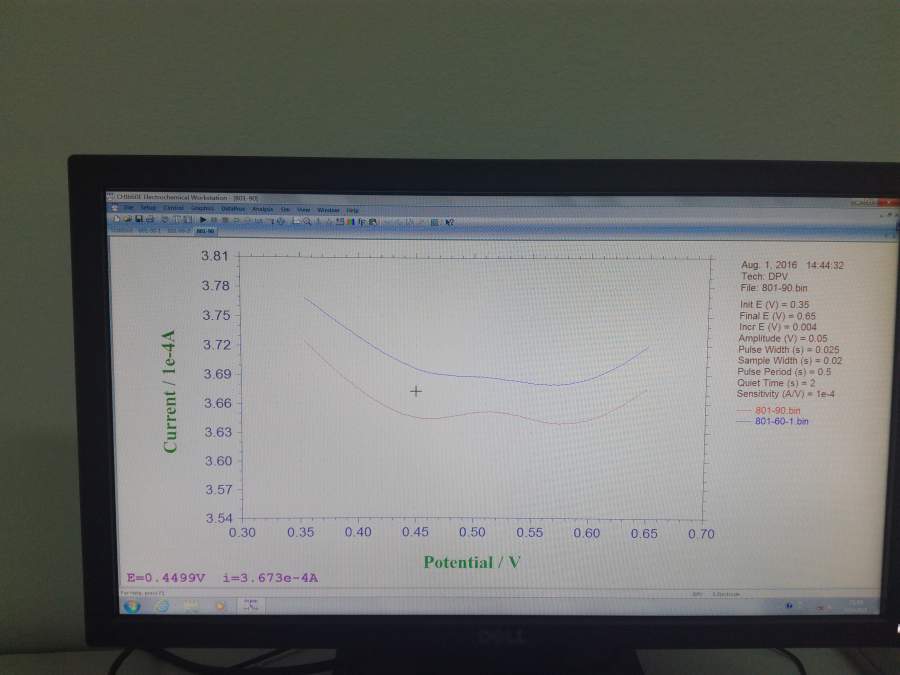 我用DPV检测一种物质,用PBS作溶剂,在测的时候,DPV曲线的两端不重合,峰的位置是对的。蓝色的浓度低,而且峰也不明显;红色的浓度高一点,峰也明显。但是蓝色的电流比红色高。我其他条件都没有变,只是检测物质浓度不一样而已。 IMG_20160801_215601.jpg |