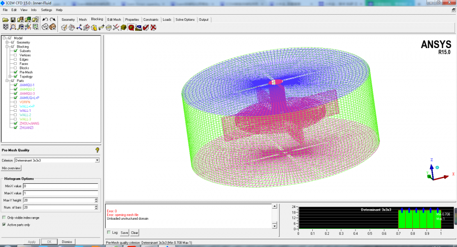 本人用ICEM离散搅拌桨加密区的结构网格,离散结束后,转化为非结构化网格遇到错误,提示: Error: 0 Error: opening mesh file Unloaded unstructured domain 求大神指点,之前这样也没遇到此类问题,不知道怎么了?急求解决 附件是本人的文件,求解决 ![]() 错误提示.png 整体截图.png |