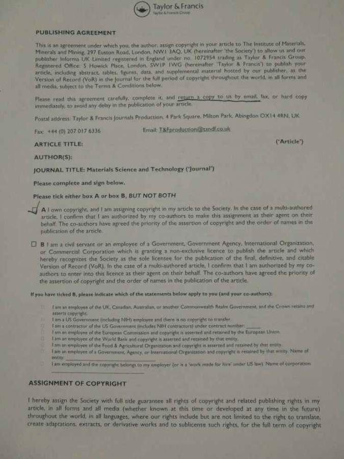assignment of copyright中需要签字,是只需要通讯作者签字还是所有的作者签字?请指教,杂志是materials science and technology文章