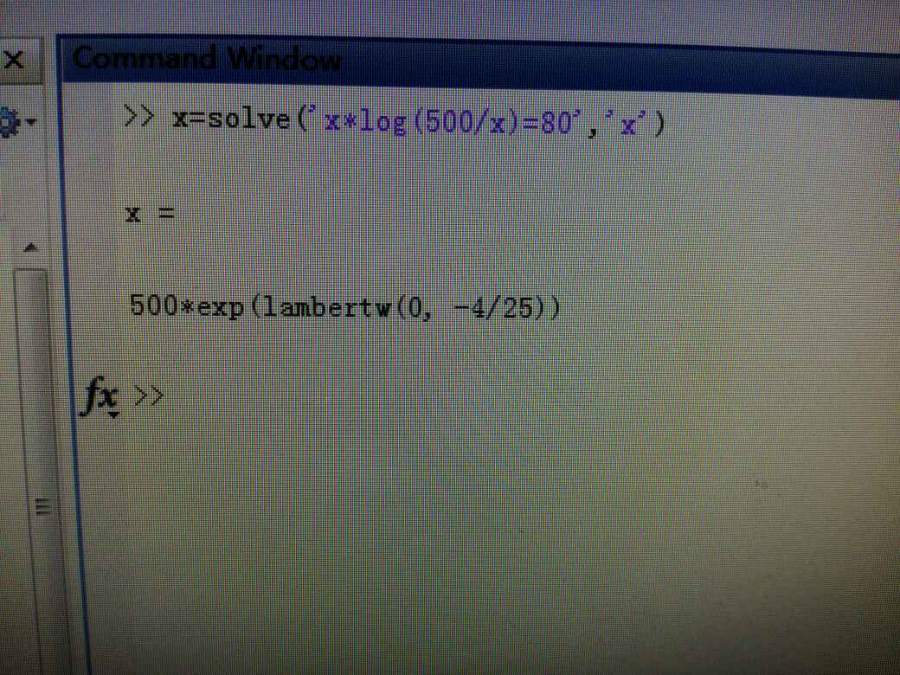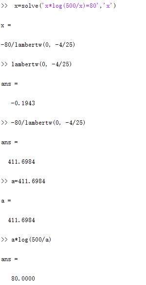 这个方程有两个解,你可以通过画函数图像看出来 x1=27.6256 x2=411.6984 x1 = fsolve(@(x)x*log(500/x)-80,1) x2 = fsolve(@(x)x*log(500/x)-80,500) |