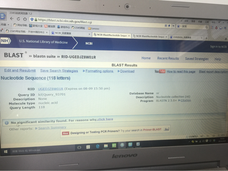 我还额外输入了物种名限定了搜索范围,我看你并没有填。另外n的数目也有影响,太短不行。直接用你自己的引物查找看有什么结果再说,不用验证我的,不同时间提交的任务,结果也会有差异。...