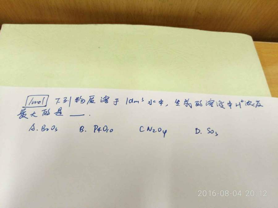 这题没有太大的难度: A和B都是弱酸,肯定不用考虑了,如果考虑也是A最少,B次少。 C和D比较,D会生成1mol/LH2SO4,由于其第二级电离很少(Ka2=0.012),因此其H+浓度大至在1.01mol/L,而N2O4配成的溶液可以得到2*2/3 = 1.33mol/L HNO3,H+浓度达到1.33mol/L,所以…… |
