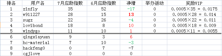 各位专家顾问: 根据7月份专家顾问应助情况:https://muchong.com/bbs/helpnum.php?formhash=7ba6321a&fid=207&view=month&sel_year=2016&sel_month=7&viewsubmit=%CC%E1%BD%BB,现公布食品版2016年7月份专家顾问vip备案情况。 7月份食品版应助有5名专家应助超过10个(目前本版一共9名专家),如下表: 本月专家们都没举办活动,故都无活动加分。 “是水货”和“mixi113”两位专家由于工作关系,于上个月向我们申请转荣,因此本月我版专家只有9人。 评价方法:https://muchong.com/bbs/viewthread.php?tid=8771593&target=self&page=1 原创帖子(每贴)奖励0.005VIP/转载帖子奖励0.0005VIP(应属于有价值的资源帖) 回帖(每贴)0.0005VIP(应为有效应助,并得到求助人认可,防止刷应助)/ 举办获得活动(每贴)0.01VIP 累积每月不超过【上限0.1】VIP |