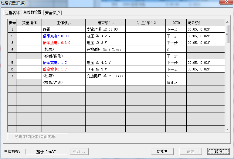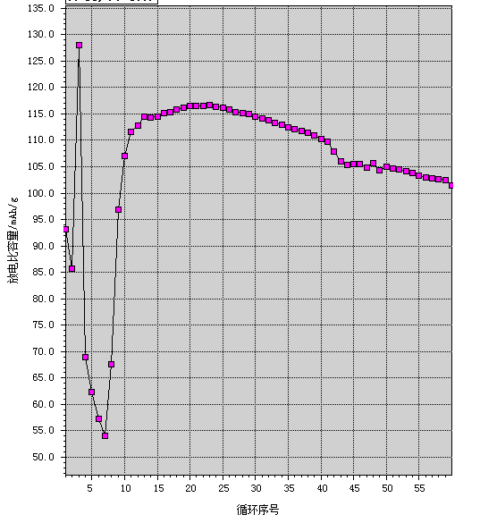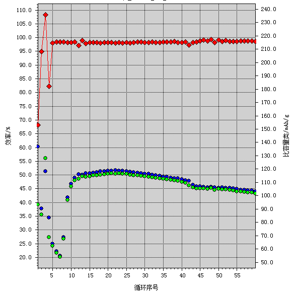 第一张图看电池的充放电平台,可以看到你的材料充电电压差不多是在3.8V,放电电压差不多在3.7V。可以参考文献中的充放电曲线进行对比。 第二张图看电池的循环稳定性或循环寿命。可以看到你的电池前十次循环容量波动比较大,10次以后容量相对稳定一些,但是衰减还是有点快。 第三张图也是看电池的循环稳定性,不过显示的数据要全面一些,上面红色的点是表示电池的充放电库仑效率(即放电比容量与充电比容量的比值),对应于左边的纵坐标。下面蓝色和绿色的点分别为充电比容量和放电比容量,对应于右边的纵坐标。 第四张图是电池测试前的程序设制,包括对测试的电压范围,所用的电流大小,循环次数等进行设定 |