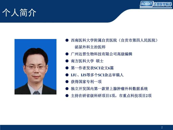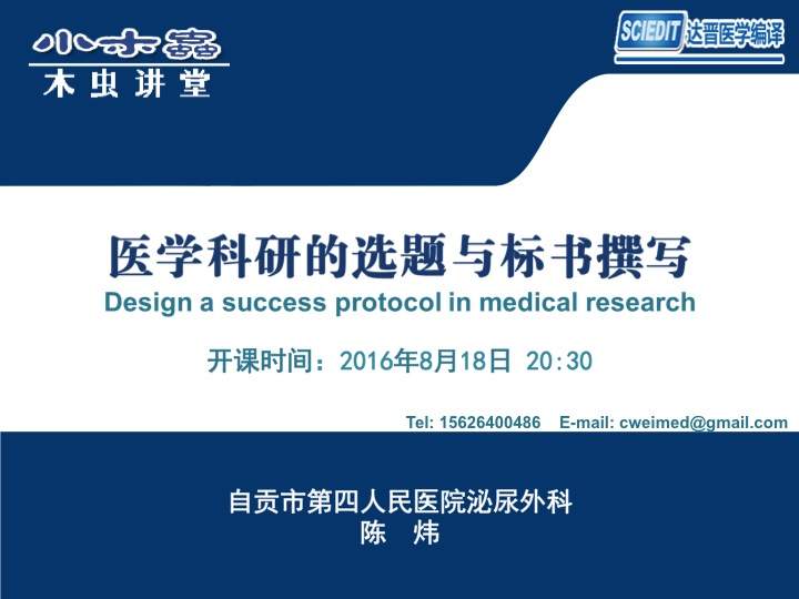 陈炜,男,西南医科大学附属自贡医院(自贡市第四人民医院)泌尿外科主治医师,南方医科大学硕士,广州达晋生物科技有限公司高级编辑。主持在研省级科研项目1项,市重点科技项目2项,参研国家863重点攻关课题、国家自然科学基金项目及广东省自然科学基金项目各一项。担任多个SCI杂志审稿人,发表SCI论文13篇,其中第一作者SCI论文6篇,获得国家专利一项,独立开发国内第一款肾上腺肿瘤外科数据统计系统。在临床及基础医学研究课题设计及实施方面具有丰富经验。在自己进行科研课题申请的同时,已帮助不少客户成功申请各级基金。该讲座是陈医生多年来撰写和申请科研基金的经验总结,希望与科研工作者分享,期待对大家科研课题写作和申请有所帮助。