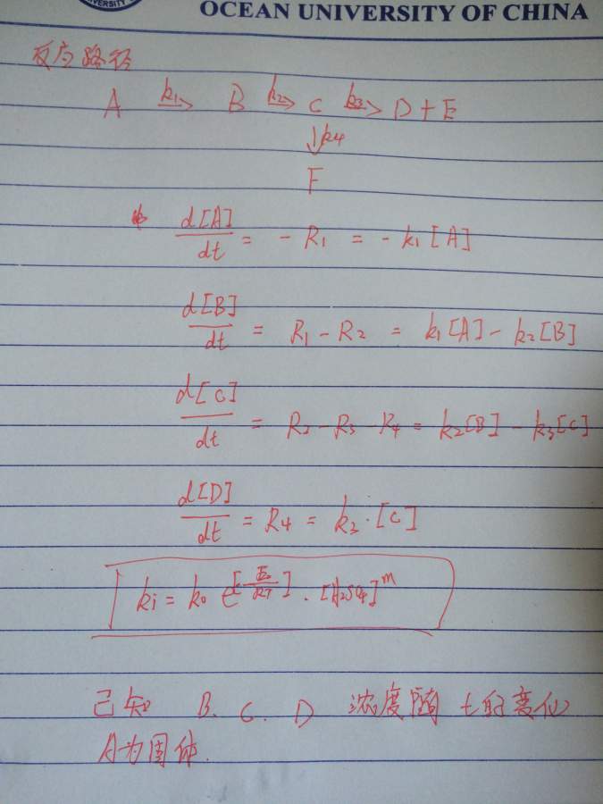 反应历程如图所示,已知B C D浓度随时间变化关系,A为固体,如何用MATLAB拟合各步反应的动力学参数? 因为不知道A的浓度变化范围,感觉无从下手。。。求大神指导,感激不尽 IMG_6059.JPG |