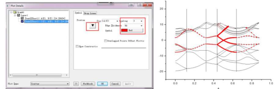 如何产生能带投影数据可以看我以前发的帖子 https://muchong.com/bbs/viewthread.php?tid=10542425 这里只介绍如何使用origin(版本8.3)画能带投影图 1. 将产生的数据导入到origin中,如下图,选中前两列进行普通能带图绘制 2. 在红色方框处右击鼠标,选中plot-setup。在出现plot-setup的对话框中,选中Bubble,然后A列和B列数据作为x轴和y轴的数据,C列作为轨道的权重,点击add->ok. 3. 双击黑色数据点,在plot-details里面进行恰当的设置如选择大小为3,edge为50,形状为6边形,然后点击OK. 4. 最后对数据图进行美观设置(线的粗细,坐标字体等)。 |