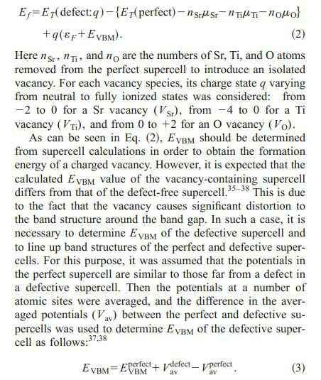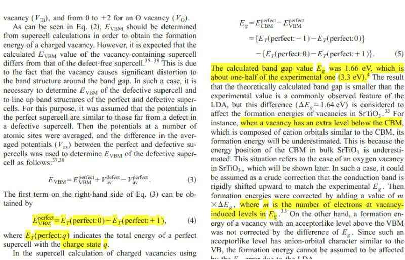 根据文献 可以得到 Ef=Etot(defect,q)-Etot(perfect)-∑nu+q(Ef+Ev+V) 其中Ev是完美晶体价带顶能量EVBM. 如文献所说Ev=E(perfect,0)-E(perfect,+1),其中0和+1为完美超胞所带电荷 请问 这里面的+1是不是就是缺陷体系带的电荷q,例如,如果计算q=-1的形成能,则Ev= E(perfect,0)-E(perfect,-1)?还是不论缺陷体系带电量为多少,完美晶格的EVBM都是 Ev=E(perfect,0)-E(perfect,+1)??完美晶格的EVBM不是应该固定的嘛,为什么会和q有关系?文献没看懂向大家求助! 或者有其他简单的计算?(例如从完美超胞的能带中直接读价带顶?可是无论castep和vasp的能带的价带顶都是以fermi能级为基准,那么对于半导体读出的值大多为0。) 到底该怎么算Ev呢? 还请大神帮帮忙啊! 非常感谢!!! 发自小木虫Android客户端 |