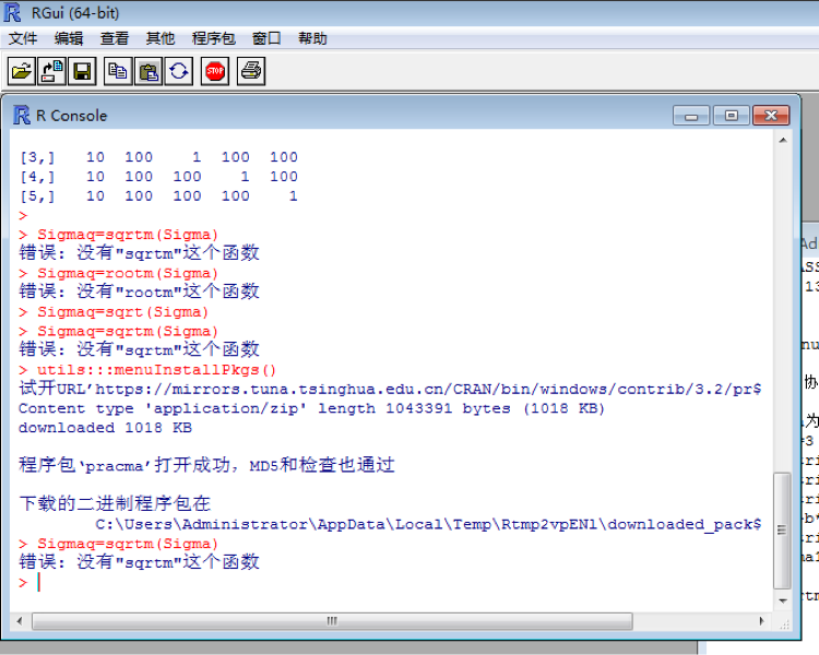 sqrt是对矩阵的每一个元素求平方根,并不是我不能满足我给出的要求,以下是程序 > A=matrix(2,2,2) > A [,1] [,2] [1,] 2 2 [2,] 2 2 > sqrt(A) [,1] [,2] [1,] 1.414214 1.414214 [2,] 1.414214 1.414214 > sqrt(A)%*%sqrt(A) [,1] [,2] [1,] 4 4 [2,] 4 4 > 发自小木虫IOS客户端 |