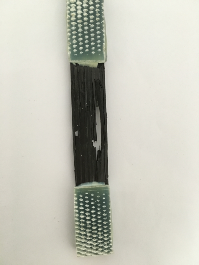 首先这是典型的单向带增强树脂基复合材料0度拉伸不理想的一种断裂模式,却是很常见的。理想的失效模式应该是工作段纤维基体完全碎裂分离,呈扫帚状。出现这种异常失效模式可能原因如下: 1、夹持部位应力集中过大,易断在加强片根部。如夹持力过大等; 2、拉伸载荷不能被均匀传递,受载大的部位首先开裂。如加强片厚度不均匀,厚的地方夹持力大等; 3、试样制备不好,纤维分布不均匀。如纵向局部纤维褶皱导致各处纤维承受拉伸载荷不同步;横向不均匀导致各处抗拉强度不同等‘ 4、试样对中不够,出现偏轴加载等。 总之出现这种现象的主要原因是材料制备和试样加工问题,试验问题仅占很小的比例。 |