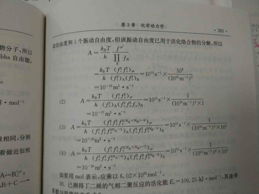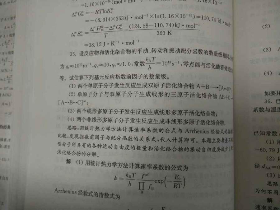 不好意思,我还没懂,振动的估值是1,这题的振动自由度也许不是0而是1,但是是所有的络合物的振动自由度都是1吗?那线性活化络合物3N-6和非线性活化络合物3N-7的规律不是没有意义吗?我没有物理化学导读那本书,只有与考研相关的物理化学参考书 发自小木虫Android客户端 |