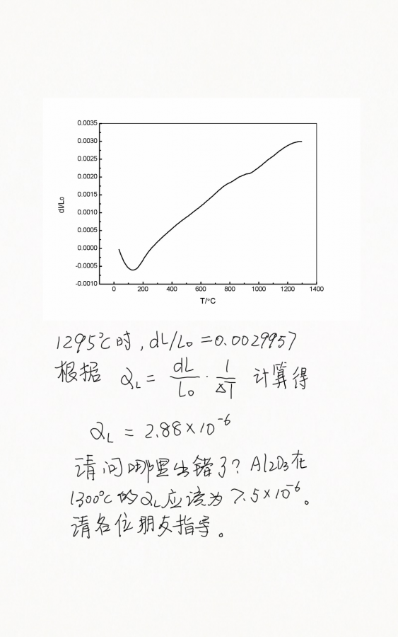 各位大神们,急求指导,根据热膨胀曲线图算出来的氧化铝的热膨胀系数怎么差这么多,哪里出错了? 测试的陶瓷样品是用工业氧化铝粉冷等静压成型后在1650摄氏度烧过的,没有添加剂。 毕业论文内容修改记录 2.png |
