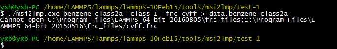 各位lammps大神好,帮我看看msi2lmp的问题,MS文件编译出来,出现一个问题“”Cannot open C rogram FilesLammps 64-bit 20160805frc_files;C rogram FilesLammps 64-bit 20150516frc_files/cvff.frc“”命令行如图所示。我在test-1文件夹下面有benzene-class2a.car,benzene-class2a.mdf,cvff.frc,msi2lmp四个文件。 msi2lmp.jpg@oxox6085 |