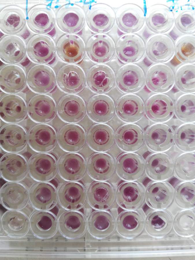 还有另外一株放线菌,除了2个孔没有显色外,其他的孔在培养了24h后也都呈紫色,包括水区对照。